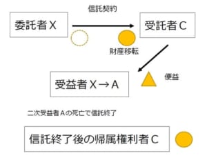 委託者はX、受託者はC、受益者は当初XでXの死後はAです。