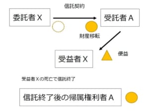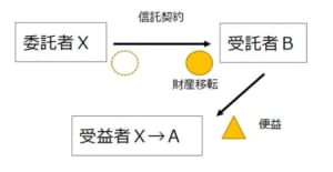 Xが自分の財産をBに移転させ、Bはその財産を管理してXが生存中はAを扶養するXに便益を与え、Xの死後は長男Aに便益を与えるということがこの信託の枠組みです。